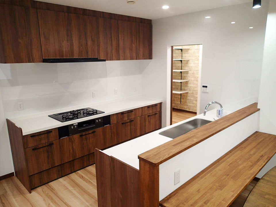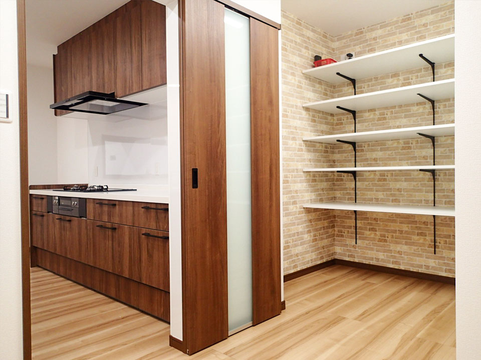 今回のリノベーションでは水廻りのリニューアルを中心に計画。特にキッチンは、空間を有効活用できるスクエア型を採用しました。これまで大きな物入れとして使われていたスペースはパントリーへと生まれ変わり、廊下側からもキッチンへ回遊できる動線を確保。